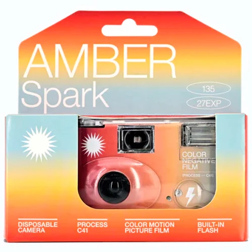 - Easy to use single use camera with a built in flash and pre loaded with Amber D400 motion picture film.