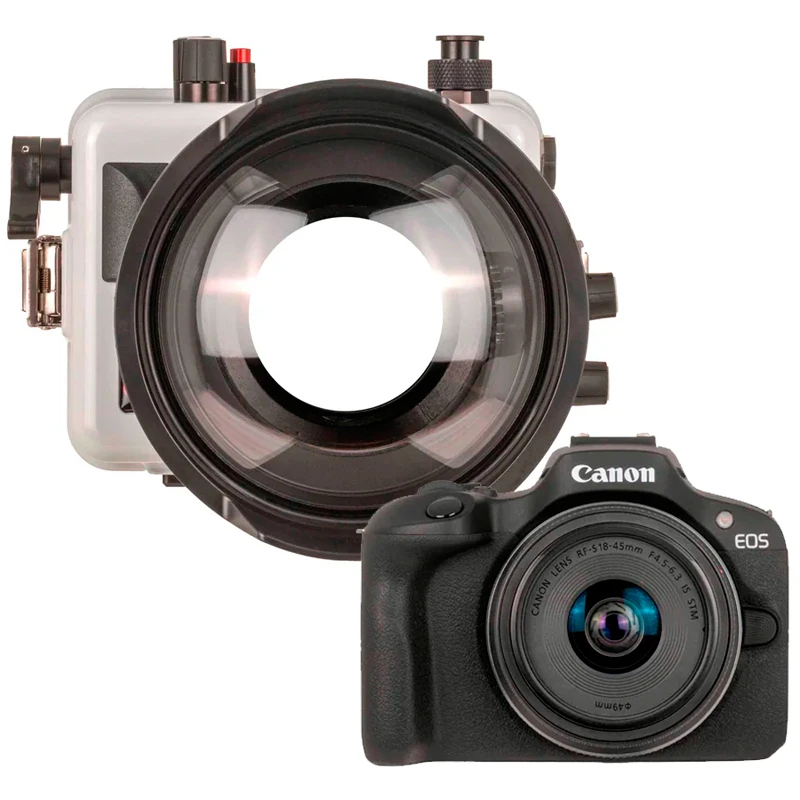 Ikelite Dry Lock Micro (DLM) underwater housing suitable for the Canon EOS R100 mirrorless camera.