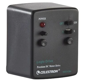 - The Celestron single-axis motor drive runs on a 9V battery, so there are no cords to get in the way.