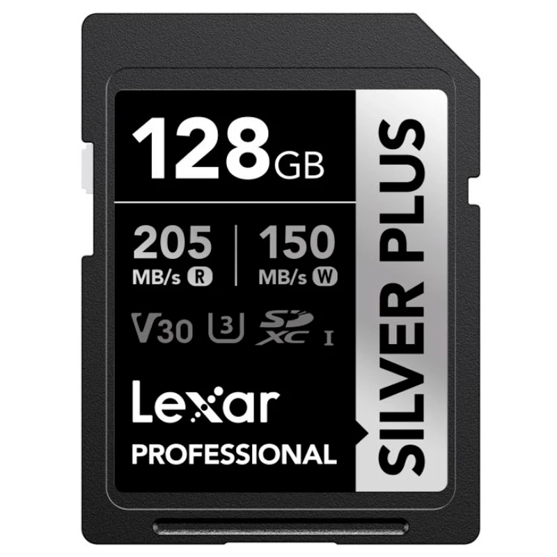 - Lexar Silver Plus series SDXC memory card with a 128GB capacity.
