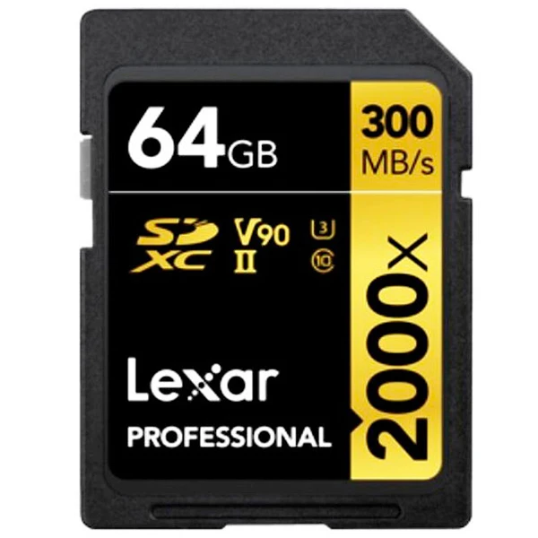 - Lexar Professional Gold series SDXC memory card with a 64GB capacity.