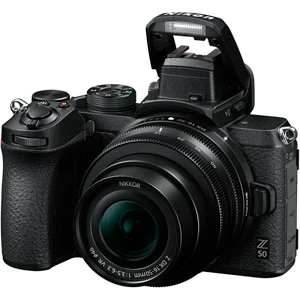 Nikon Z 50 DX format interchangeable lens compact system camera in Black complete with the Nikkor Z DX 16-50mm F3.5-6.3 VR zoom lens. A wide Nikon Z mount lets the large 20.9 megapixel DX format sensor capture more light across the frame, and with more light comes more detail. Up to 11 frames per second continuous shooting with autofocus and auto exposure. Rechargeable lithium ion battery. The ultra sharp electronic viewfinder lets you see everything clearly, whether you are shooting stills or video. The EVF can display a natural image similar to that of a DSLR optical viewfinder. Or you can view images as they will look with settings applied. You can record 4K / UHD movies at 30p, and shoot slow motion footage in Full HD. You can also capture still frames while filming and create dramatic 4K time lapse sequences in camera. Compact and lightweight body with a strong magnesium alloy top and front. The large, high resolution LCD monitor features smartphone style touch controls and can be tilted up or down. Built in WiFi and Bluetooth to quickly connect to any smart device with SnapBridge. 20 built in creative effects are available for stills and video.