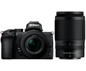 Nikon Z 50 DX format interchangeable lens compact system camera in Black complete with the Nikkor Z DX 16-50mm F3.5-6.3 VR and Nikkor Z DX 50-250mm F4.5-6.3 VR zoom lenses. A wide Nikon Z mount lets the large 20.9 megapixel DX format sensor capture more light across the frame, and with more light comes more detail. Up to 11 frames per second continuous shooting with autofocus and auto exposure. Rechargeable lithium ion battery. The ultra sharp electronic viewfinder lets you see everything clearly, whether you are shooting stills or video. The EVF can display a natural image similar to that of a DSLR optical viewfinder. Or you can view images as they will look with settings applied. You can record 4K / UHD movies at 30p, and shoot slow motion footage in Full HD. You can also capture still frames while filming and create dramatic 4K time lapse sequences in camera. Compact and lightweight body with a strong magnesium alloy top and front. The large, high resolution LCD monitor features smartphone style touch controls and can be tilted up or down. Built in WiFi and Bluetooth to quickly connect to any smart device with SnapBridge. 20 built in creative effects are available for stills and video.