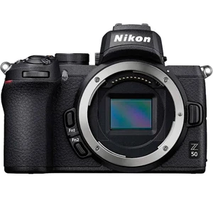 Nikon Z 50 DX format interchangeable lens compact system camera body only (no lens supplied) in Black. A wide Nikon Z mount lets the large 20.9 megapixel DX format sensor capture more light across the frame, and with more light comes more detail. Up to 11 frames per second continuous shooting with autofocus and auto exposure. Rechargeable lithium ion battery. The ultra sharp electronic viewfinder lets you see everything clearly, whether you are shooting stills or video. The EVF can display a natural image similar to that of a DSLR optical viewfinder. Or you can view images as they will look with settings applied. You can record 4K / UHD movies at 30p, and shoot slow motion footage in Full HD. You can also capture still frames while filming and create dramatic 4K time lapse sequences in camera. Compact and lightweight body with a strong magnesium alloy top and front. The large, high resolution LCD monitor features smartphone style touch controls and can be tilted up or down. Built in WiFi and Bluetooth to quickly connect to any smart device with SnapBridge. 20 built in creative effects are available for stills and video.