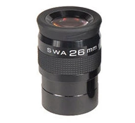 26mm OVL PanaView SWA 2 inch eyepiece. PanaView eyepieces feature 5 element construction with giant, oversized eye lens elements. Ideal for enthusiasts of low power, deep sky observing. Features an impressively wide 70 degree field of view. Eye relief of 20mm, ideal for spectacle wearers. Fully broadband multi coated with blackened lens edges and parfocal. Accepts 2 inch threaded filters. Soft twist up rubber eyecups for comfortable viewing. Finished in high gloss anodised aluminium with knurled rubber grips.