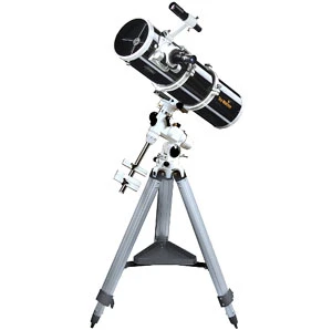 Parabolic newtonian reflector astronomical telescope with a 150mm (6 inch) diameter primary mirror. High quality, EQ3-2 equatorial mount. Comes with an aluminium tripod with accessory tray, 25mm 1.25″ eyepiece supplied, 6×30 finderscope and 2″ dual speed 10:1 Crayford focuser. 33% more light gathering than a 130mm scope. Magnification with supplied eyepiece is 30x. Compatible with SkyWatcher’s Newtonian Coma corrector (not included) for improved astro photography.