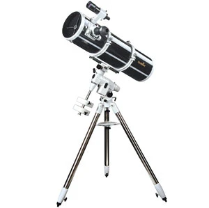 Parabolic newtonian reflector astronomical telescope with a 200mm (8 inch) diameter primary mirror. High quality, heavy duty EQ5 equatorial mount. Comes with a stainless steel tripod, 28mm 2″ LET eyepiece, 9×50 finderscope and a 2″ dual speed 10:1 Crayford focuser. 77% more light gathering than a 150mm scope. Magnification with supplied eyepiece is 36x. Compatible with SkyWatcher’s Newtonian Coma corrector (20233) (not included) for improved prime focus astro photography.