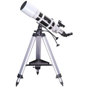 Achromatic refractor telescope with a 120mm (4.75 inch) diameter objective lens. Good telescope for astrophotography and also for daytime terrestrial use. Comes with 10mm and 25mm 1.25″ eyepieces, red dot finder, dual fit 1.25″/2″ focuser, 45 degree erect image diagonal 1.25″ and aluminium tripod with accessory tray. Magnifications with supplied eyepieces 24x and 60x. 38% more light gathering than an 102mm scope.