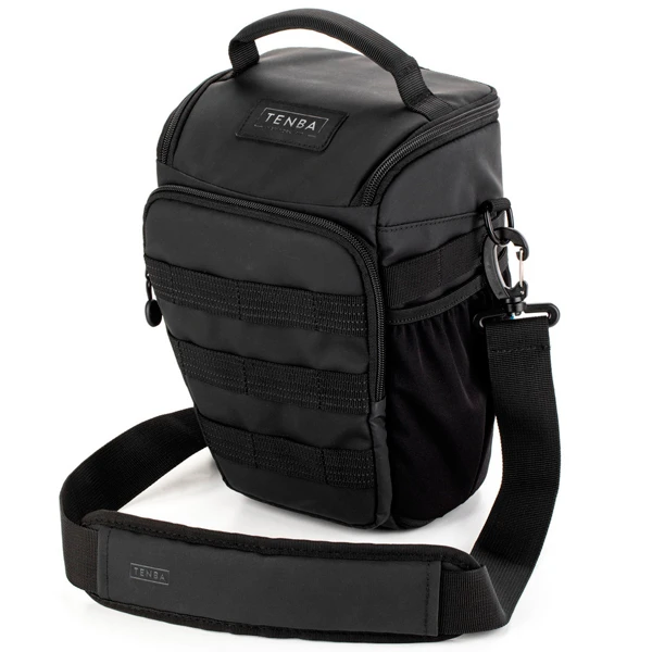 Tenba’s tactical Axis bags were inspired by the ultra-durable bags we’ve made for the military throughout our 40+ year history. The 4L Top Loader will fit a Mirrorless or DSLR camera with an attached lens up to 6 inches (15 cm) long, like a 24-70mm 2.8, and it can be expanded at the bottom to fit a lens as long as a 70-200mm 2.8. It also fits a DJI Mavic and other compact drones. MOLLE webbing allows limitless expandability with Tenba Tools, such as Lens Capsules, Battery Pouches and Memory Card Wallets, as well as a multitude of military-standard pouches and accessories. This is the first camera bag to include a hidden pocket compatible with an Apple AirTag or Tile Bluetooth Tracker. The lid opens away from your body, so it doesn’t interfere with removing gear quickly. The Top Loader can be carried with the included shoulder strap or attached to your belt. It can also be attached to the hip belt on the Axis 20/24/32L backpacks.